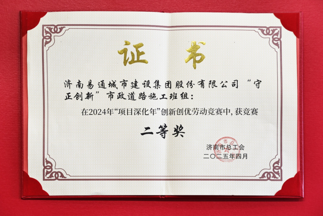 易通城建集团“守正创新”市政道路施工班组获得2024 年“项目深化年”创新创优劳动竞赛班组二等奖。